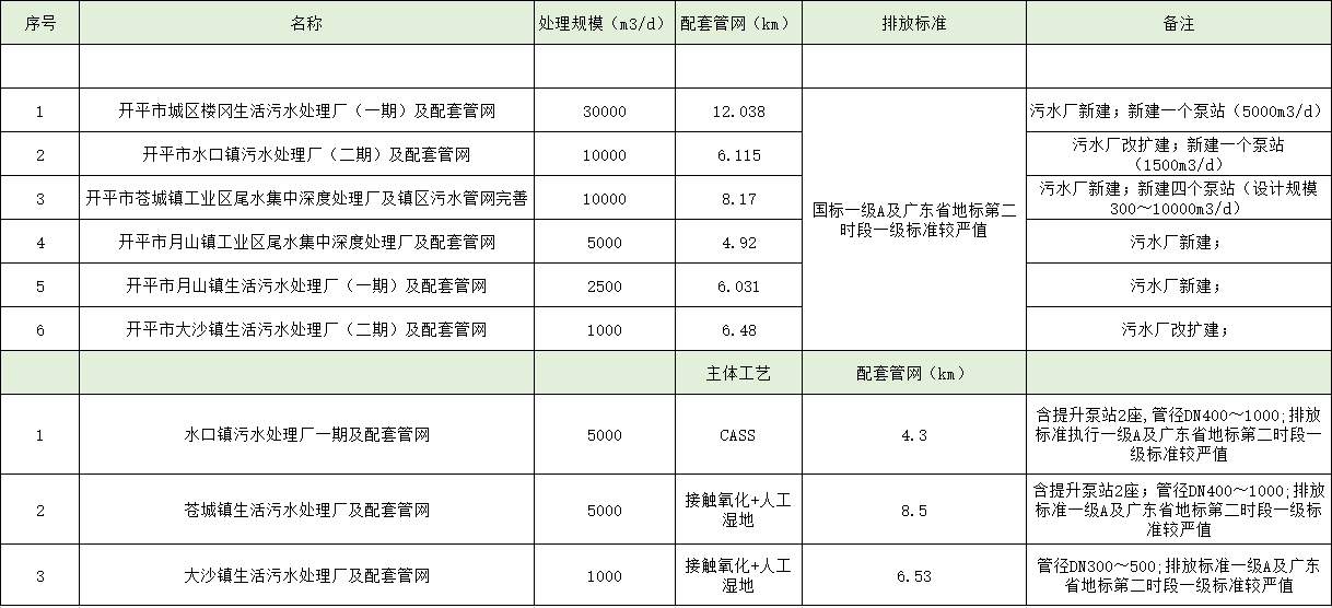 新建污水處理設施由六個子項目構成,包括:開平市城區(qū)樓岡生活污水處理廠(一期)及配套管網工程、開平市水口鎮(zhèn)污水處理廠二期及配套管網項目、開平市蒼城鎮(zhèn)工業(yè)區(qū)尾水集中深度處理廠及鎮(zhèn)區(qū)污水管網完善項目、開平市月山鎮(zhèn)工業(yè)區(qū)尾水集中深度處理廠及配套管網工程、開平市月山鎮(zhèn)生活污水處理廠(一期)及配套管網工程、開平市大沙鎮(zhèn)生活污水處理廠二期及配套管網項目