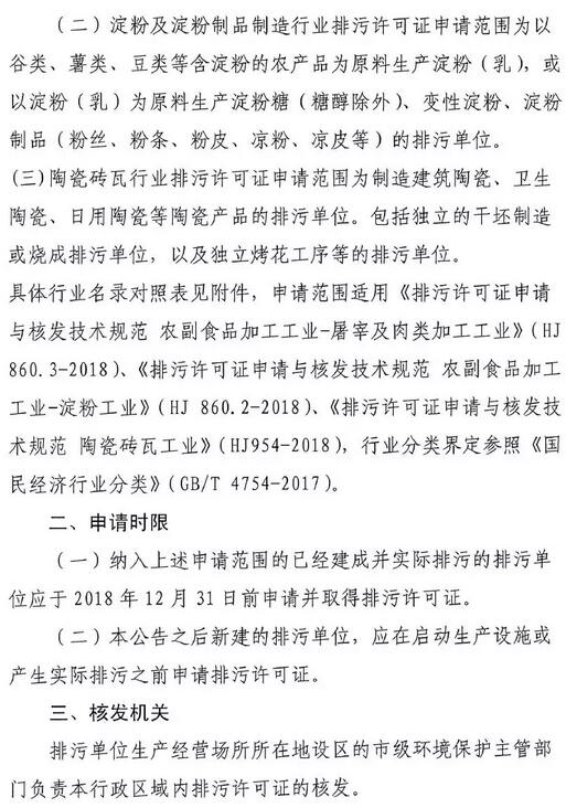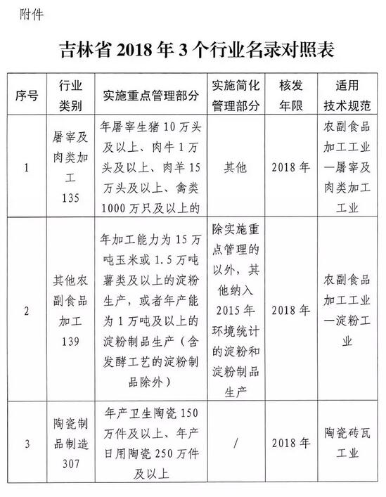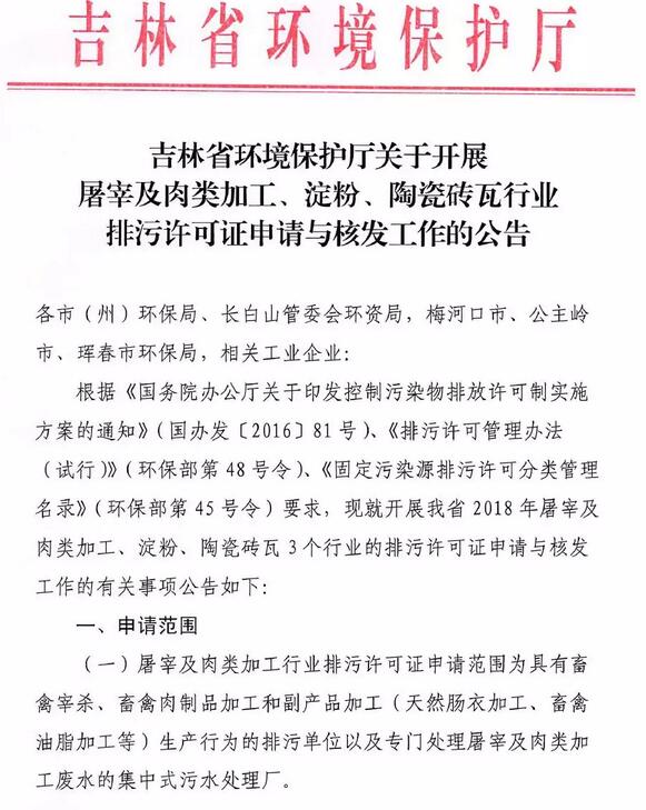根據(jù)《國務(wù)院辦公廳關(guān)于印發(fā)控制污染物排放許可制實(shí)施方案的通知》(國辦發(fā)【2016】81號)、《排污許可管理辦法試行》(環(huán)保部第48號令)、《固定污染源排污許可分類管理名錄》(環(huán)保部第45號令)要求,吉林省現(xiàn)開展2018年屠宰及肉類加工、淀粉、陶瓷磚瓦3個行業(yè)的排污許可證申請與核發(fā)工作。詳情如下: